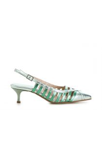 Dècollète de piel laminada con juego de bandas laterales en un tono de color más oscuro pero a juego. Hebilla en la parte trasera y tacón medio.