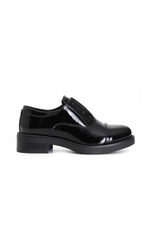 Francesina de mujer en piel sintética efecto charol con elástico central y tachuelas. la plantilla es de piel.