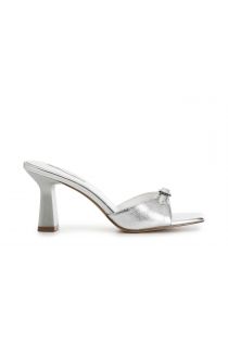 Zueco de madera abierto con hebilla. accesorio de pedrería. plantilla de piel. tacón de 70 mm de altura.