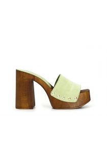 Zuecos con banda de descarne disponibles en 6 colores. plataforma y tacón de madera oscura y plantilla de ante a juego con el color de la banda.