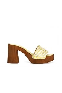 zuecos con tacón de madera y banda decorativa de rafia trenzada bicolor multi yellow